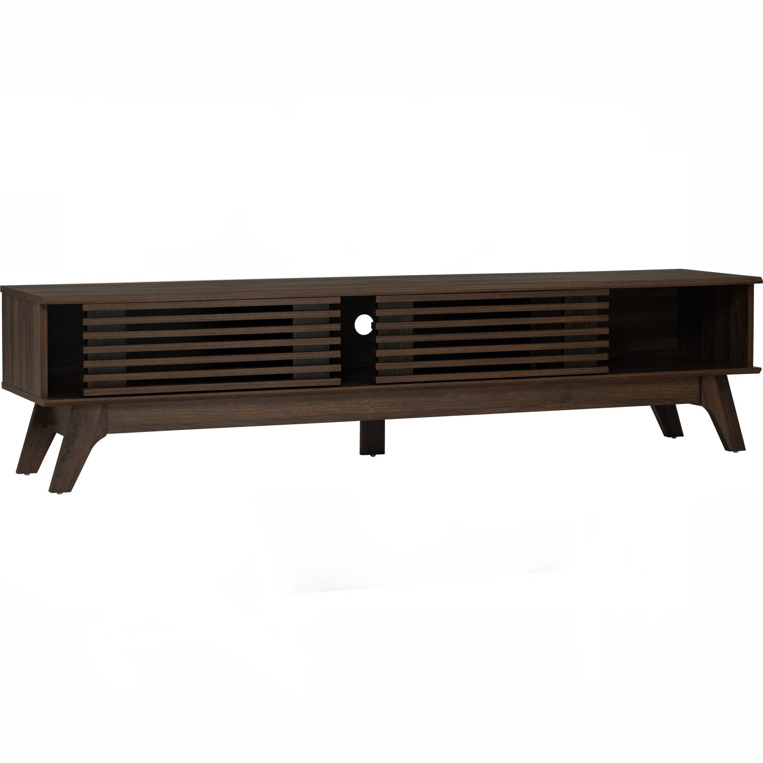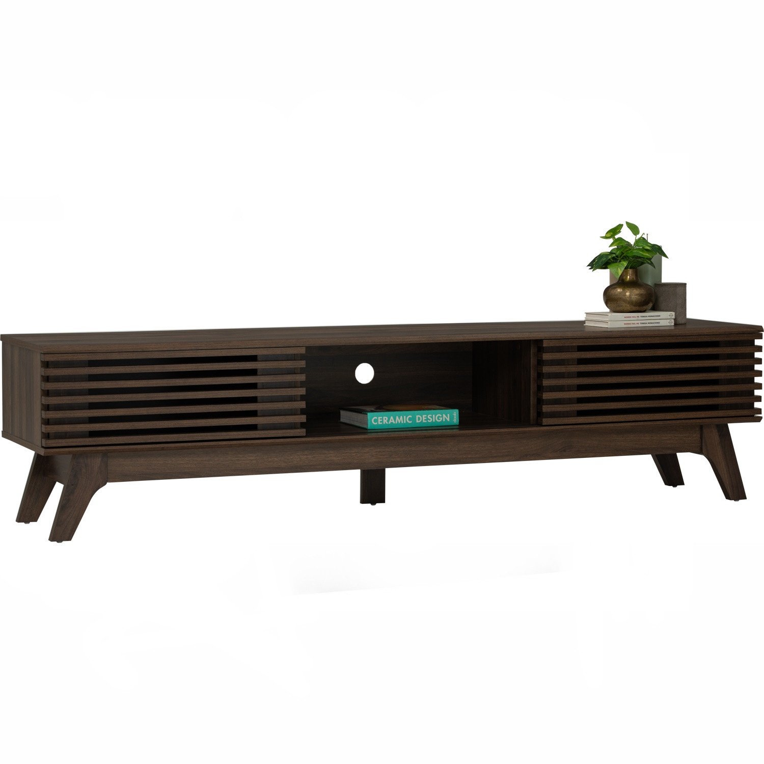 Floro 1.8m tv cabinet in Walnut colour. The Floro 1.8M TV Cabinet reflects Contemporary style, offering a simple yet refined storage solution. Crafted entirely from laminated board in a warm walnut finish, it balances durability with clean modern lines. Its low, elongated form provides a generous surface for large televisions while concealing storage space below. Ideal for compact apartments or larger living rooms, it delivers everyday practicality with a sleek appearance. The Floro Cabinet is a best-value option for those seeking functionality with a timeless design.