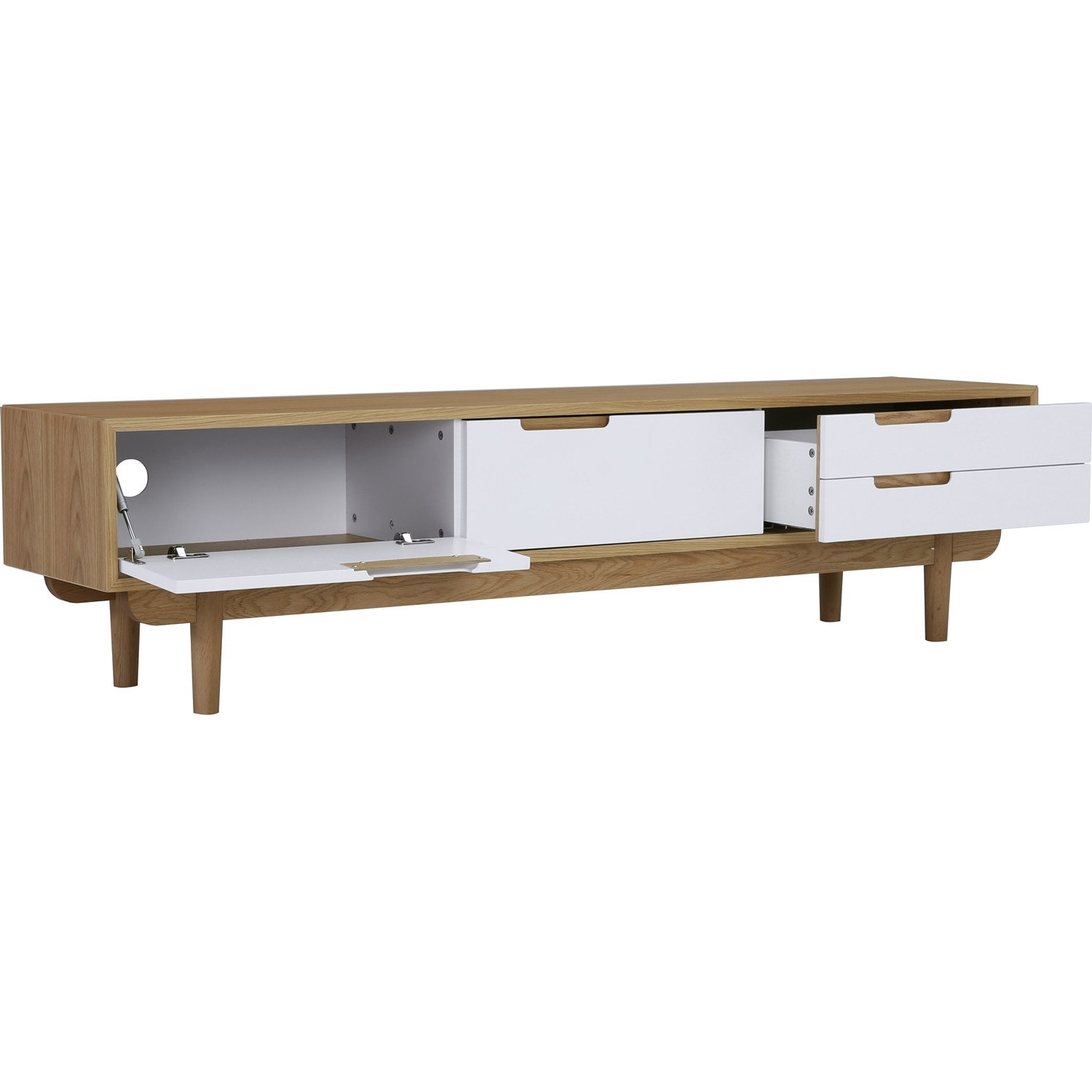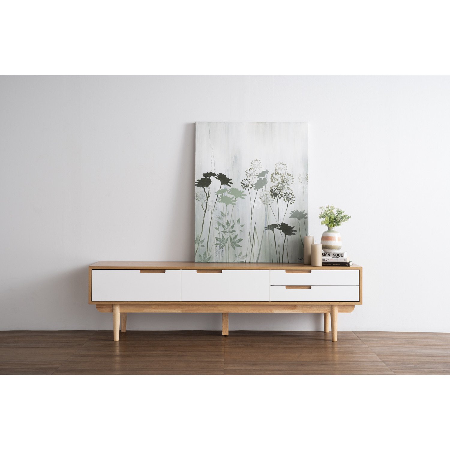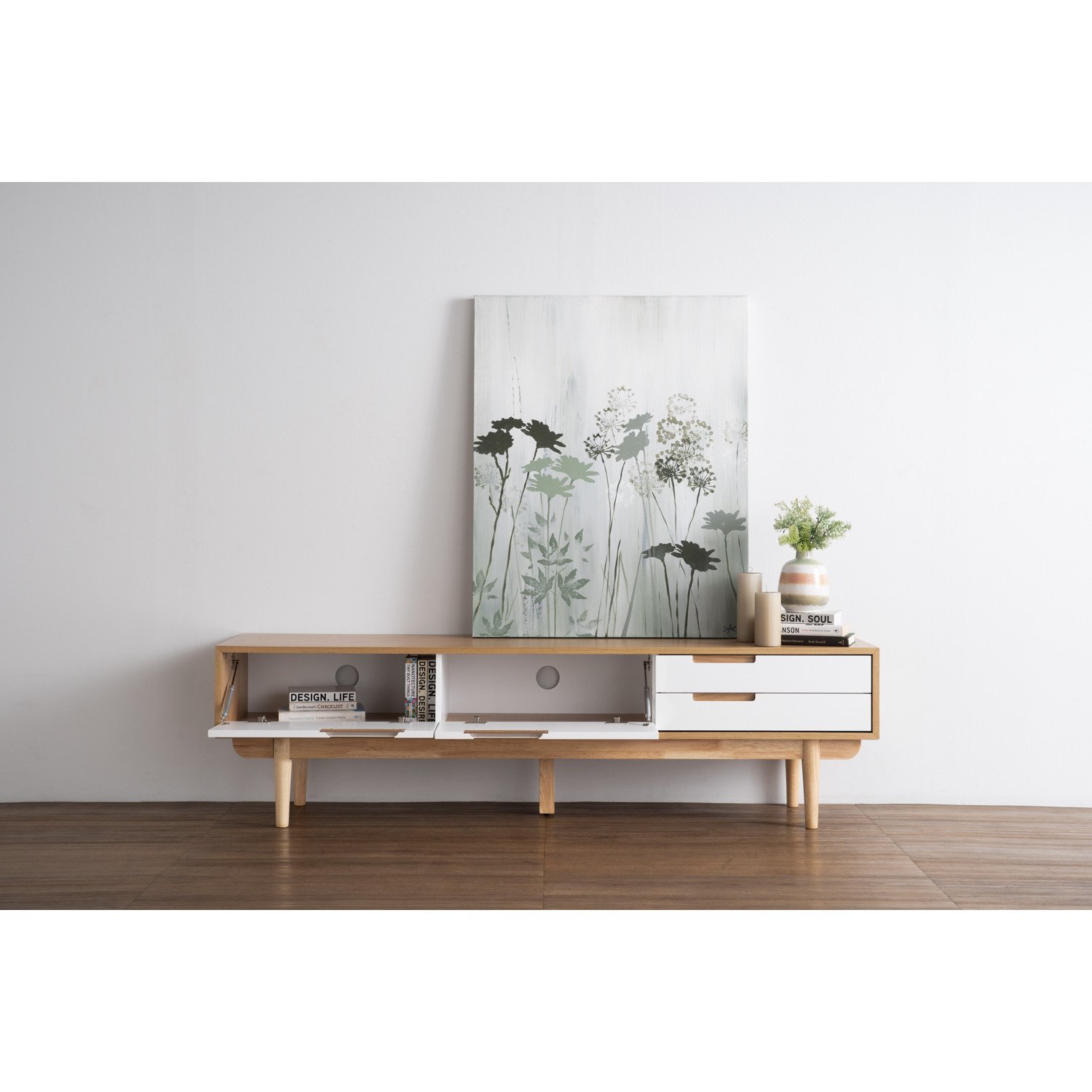 Nakula TV Cabinet in Oak colour body, White colour door, with Oak colour leg. The Nakula 1.8M TV Cabinet highlights Scandinavian simplicity with Malaysian Oak legs and an ash veneer body. Accented with white lacquer details, it creates a light and refined look. Sturdy and functional, it offers practical storage while maintaining a clean design. A versatile cabinet ideal for contemporary living spaces.
